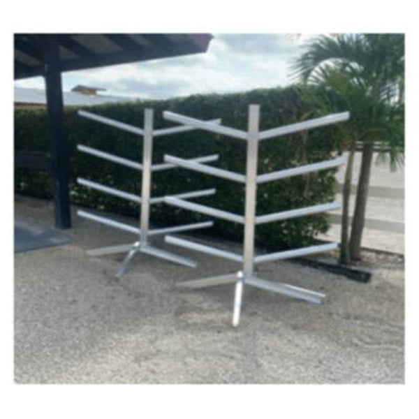 Keep the poles off the wet ground and neatly on these Aluminum Stand Alone Pole Racks. Made of sturdy unpainted aluminum as Aluminum Does't Rust Like Steel. For years of use!